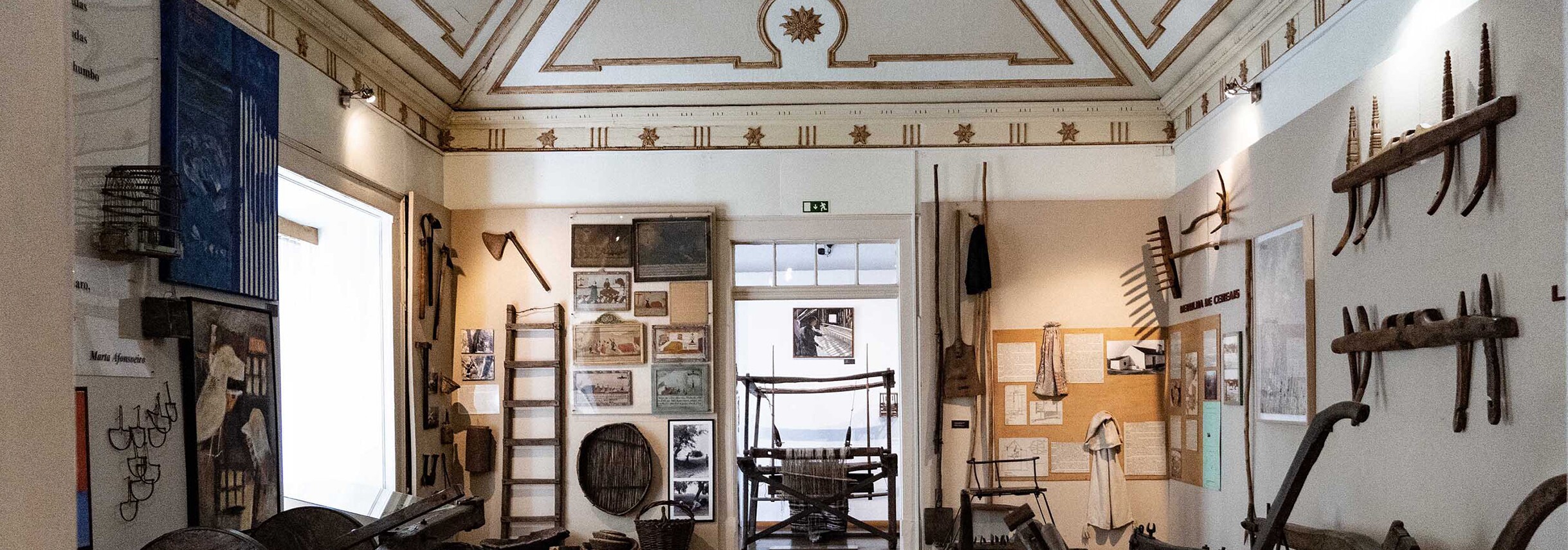Tradicional cultura material própria das atividades de fiação e tecelagem do linho e da lã e da confeção de vestuário, com peças do século XIX e 1ª metade do século XX. Pintura alusiva aos ambientes aqui invocados.