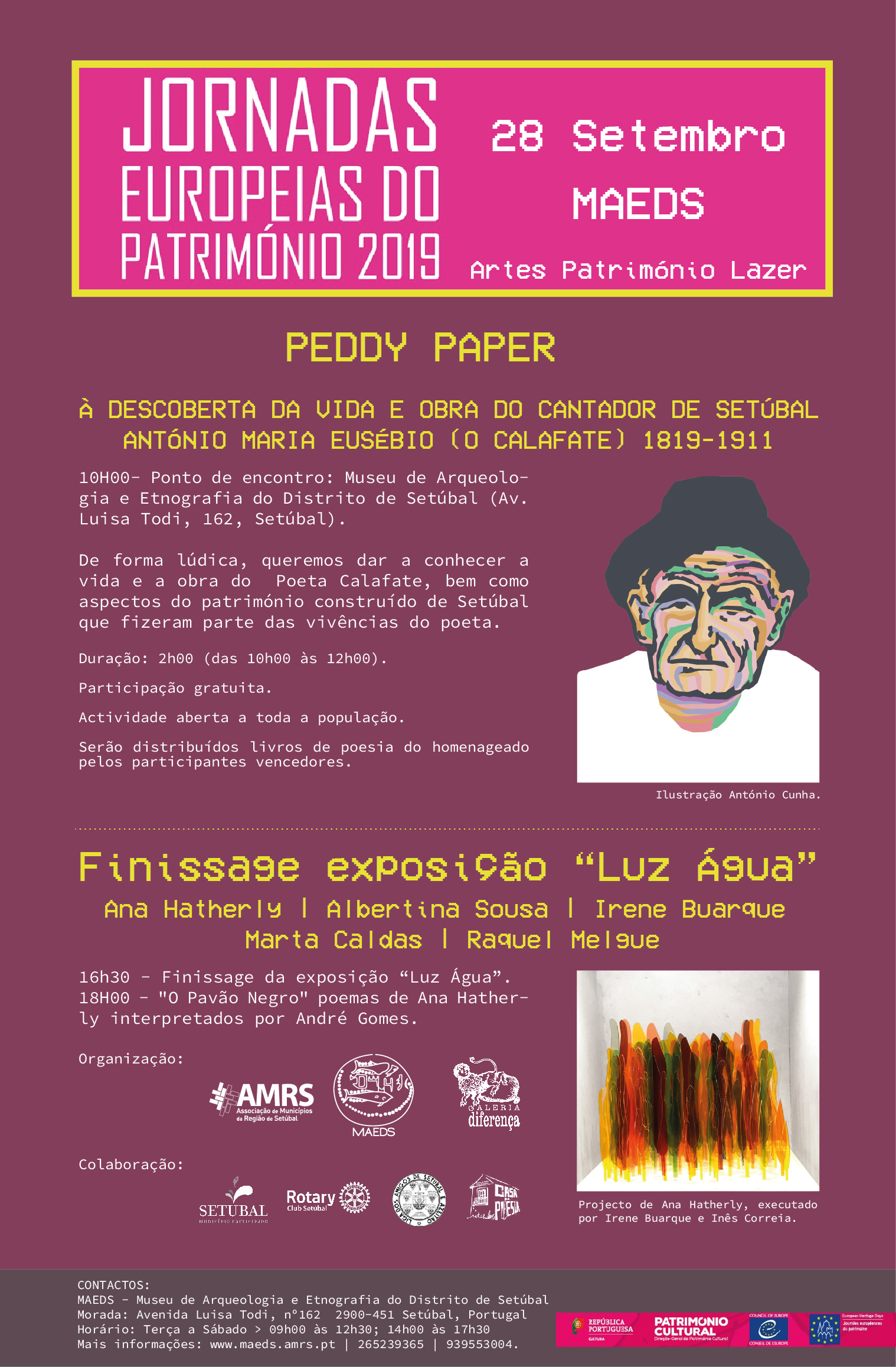 10H00- Ponto de encontro: Museu de Arqueologia e Etnografia do Distrito de Setúbal (Av. Luisa Todi, 162, Setúbal). De forma lúdica, queremos dar a conhecer a vida e a obra do Poeta Calafate, bem como aspectos do património construído de Setúbal que fizeram parte das vivências do poeta.