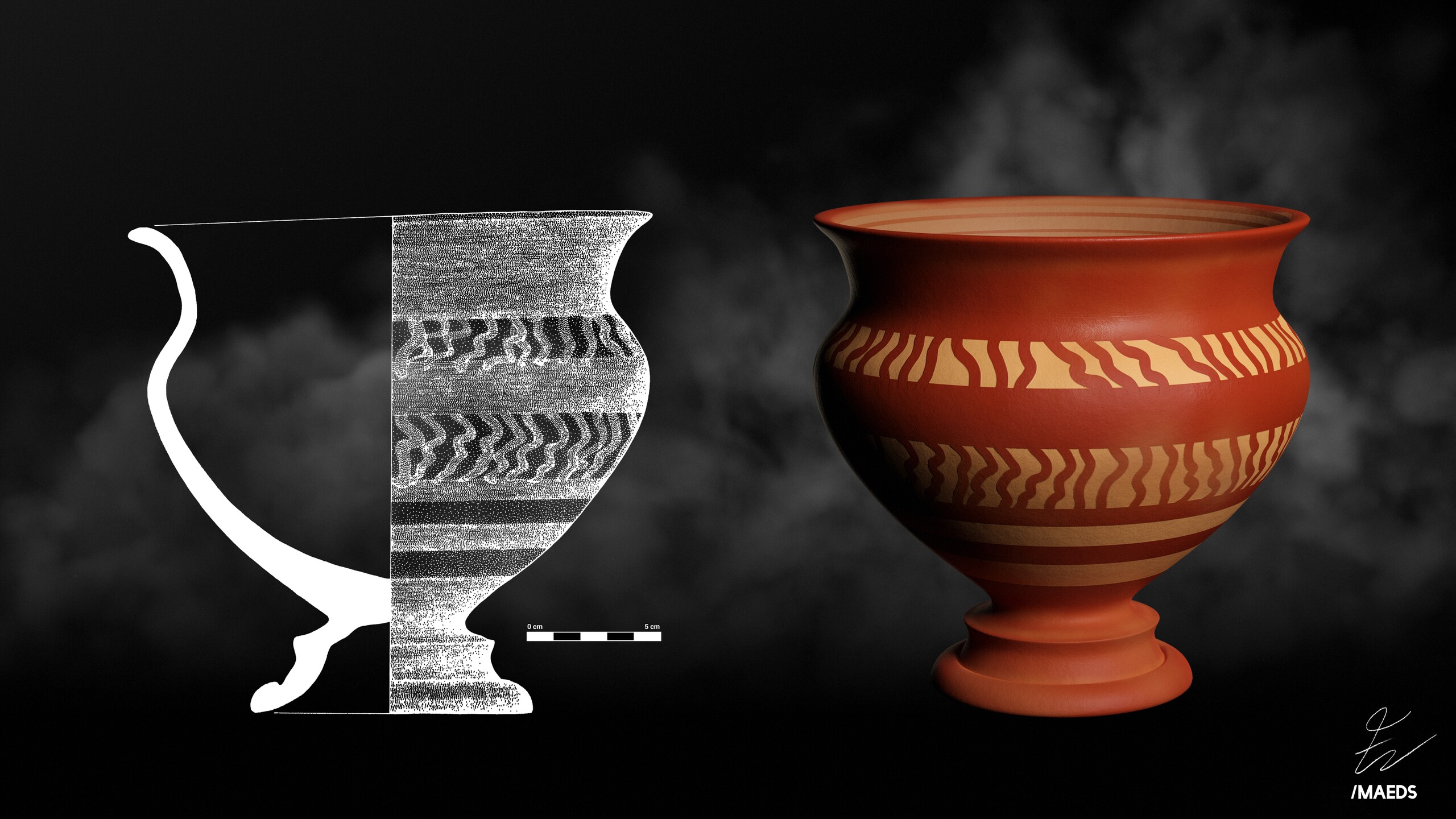 Vaso caliciforme de cerâmica, decorado com pintura de bandas e traços verticais ondulados de coloração vermelha (séc. III-II a.C.) recuperado no depósito votivo de Garvão (Ourique). Possui cerca de 20cm de diâmetro de bordo e uma altura de aproximadamente 18,5cm.