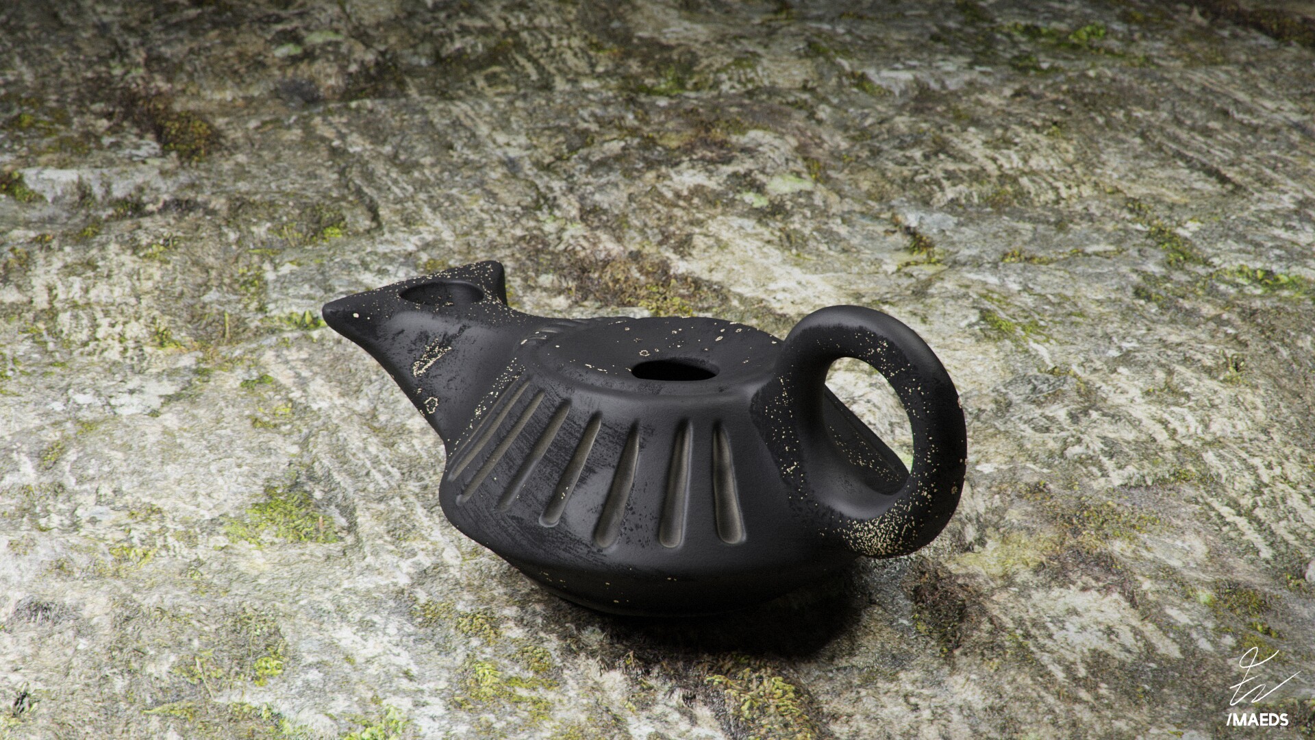Lucerna de cerâmica de verniz negro itálico de tradição helenística (tipo G de Ricci/ Dressel 1B), datada entre 130 e 30 a. C. Foi recuperada em um contexto habitacional (compartimento T16) datado c. 70-40 a.C. (Fase IIIB de Chibanes). Comprimento c. 8,3cm. Imagem 3D realizada em Blender. Elaborada por Francisco de Lima Nunes.