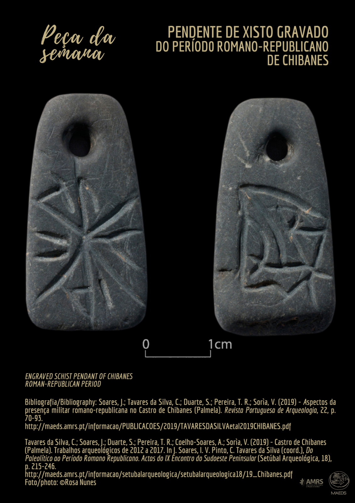 Deixámos para o final da rubrica Peça da Semana, que agora termina com a abertura do MAEDS no próximo dia 2 de Junho, um objecto não estandardizado, de cunho muito pessoal e execução naif cuja real decifração ficará talvez para sempre no domínio das hipóteses, face à impossibilidade de aceder aos códigos de representação gráfica de um presumível legionário, provavelmente hispano, que estacionou em caserna do fortim romano-republicano de Chibanes, mais propriamente no Compartimento T16, algures entre 110 e 72 a. C. (C.3B). Abandonado ou perdido, este pendente havia sido gravado com estilete ou punção metálico de ponta romba em ambas as faces de pequeno seixo rolado com perfuração bicónica destinada à sua suspensão. No anverso existe a representação de um feixe de elementos que irradiam de um ponto central o qual, em termos gerais, nos sugere padrão iconográfico de escudo romano. No reverso parece existir a representação, muito esquemática, de pequena embarcação de vela latina. Em ambas as composições parecem ter sido incluídos como elementos decorativos (?) caracteres de línguas paleo-hispânicas, ainda em estudo pelo Prof. José António Corrêa da Universidade de Sevilha. Mas que caminhos terá percorrido este legionário antes de chegar a Chibanes? Foi então necessário atender à natureza petrográfica do suporte. O Prof. Paulo Emanuel Fonseca, da Faculdade de Ciências da Universidade de Lisboa, admitiu tratar-se de um xisto grafitoso da formação do Paraíso da zona de Aljustrel, antiga Vipasca. Um percurso de Vipasca a Chibanes passando por Salacia adquire verosimilhança. A biografia dos objectos contém a biografia dos seus fazedores para lá da ambiguidade dos símbolos.