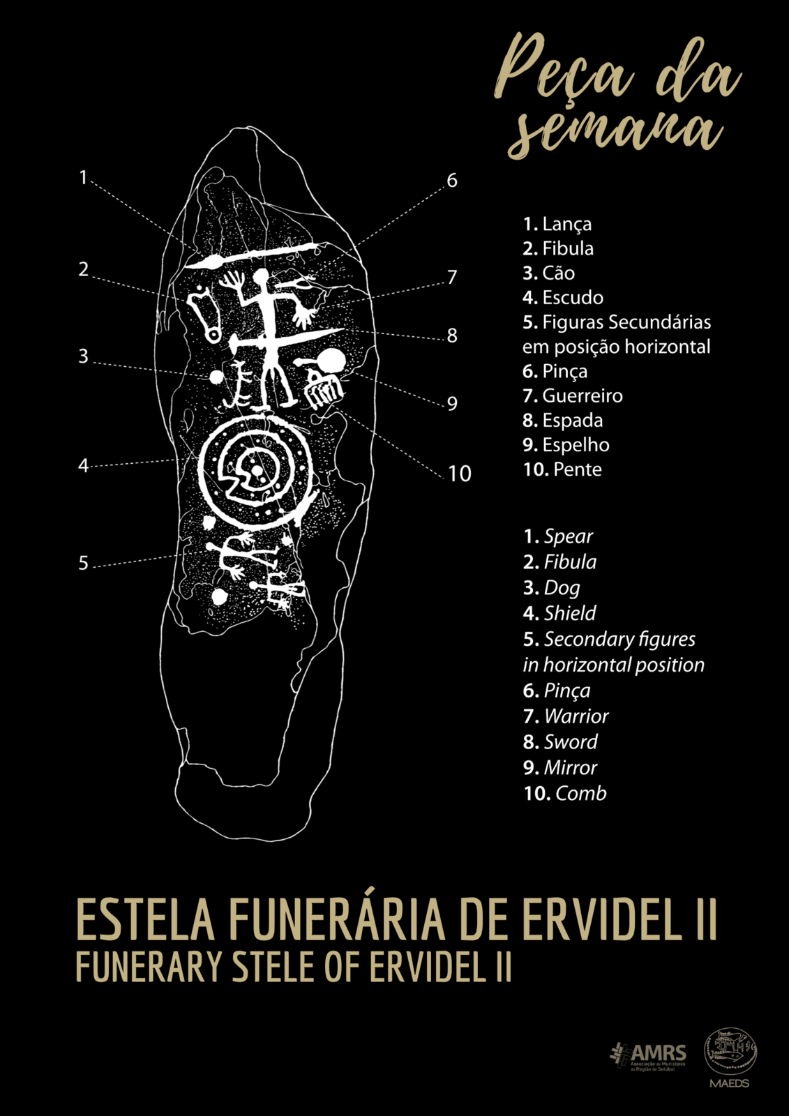 The funerary stele of Ervidel II, on greywacke-schist, is 1.75m x 0.59m x 0.23m. The symbolic elements engraved on one of its faces, link this monumental artefact to the Extremadure group of the Southwestern Iberia grave stelae, dating back, from the Late Bronze Age. This stele has been found in a secondary position, in the necropolis of cistlike graves of Herdade de Pomar, Parish of Ervidel, Municipality of Aljustrel. The carved motives occupy almost three quarters of the total prepared area, and they are organized into three levels: − In the centre, there is a highlighted representation of a V-notched shield; − In the upper level, there is a phallic human figure, very stylized, probably representing a local chief surrounded by prestige items and weapons. That personage exhibits a sword of “língua de carpa” type at the waist. There is a spear above the head, and tweezers, above the left shoulder. At the front, there is a fibula. A dog, a mirror and a comb are lying below. Similar objects have been found in other contexts like the tomb of Roça do Casal do Meio, near Sesimbra, dated by radiocarbon from mid-11th century till the end of the 9th century BC. − In the lower level, we can see, in a defeated position, two clearly devaluated human figures in comparison to the powerful warrior, represented on the top. The stele of Ervidel II displays the power of a local or regional chief in a period in which social stratification emerged. Charismatic chiefs centralized the political power and became heroized leaders.