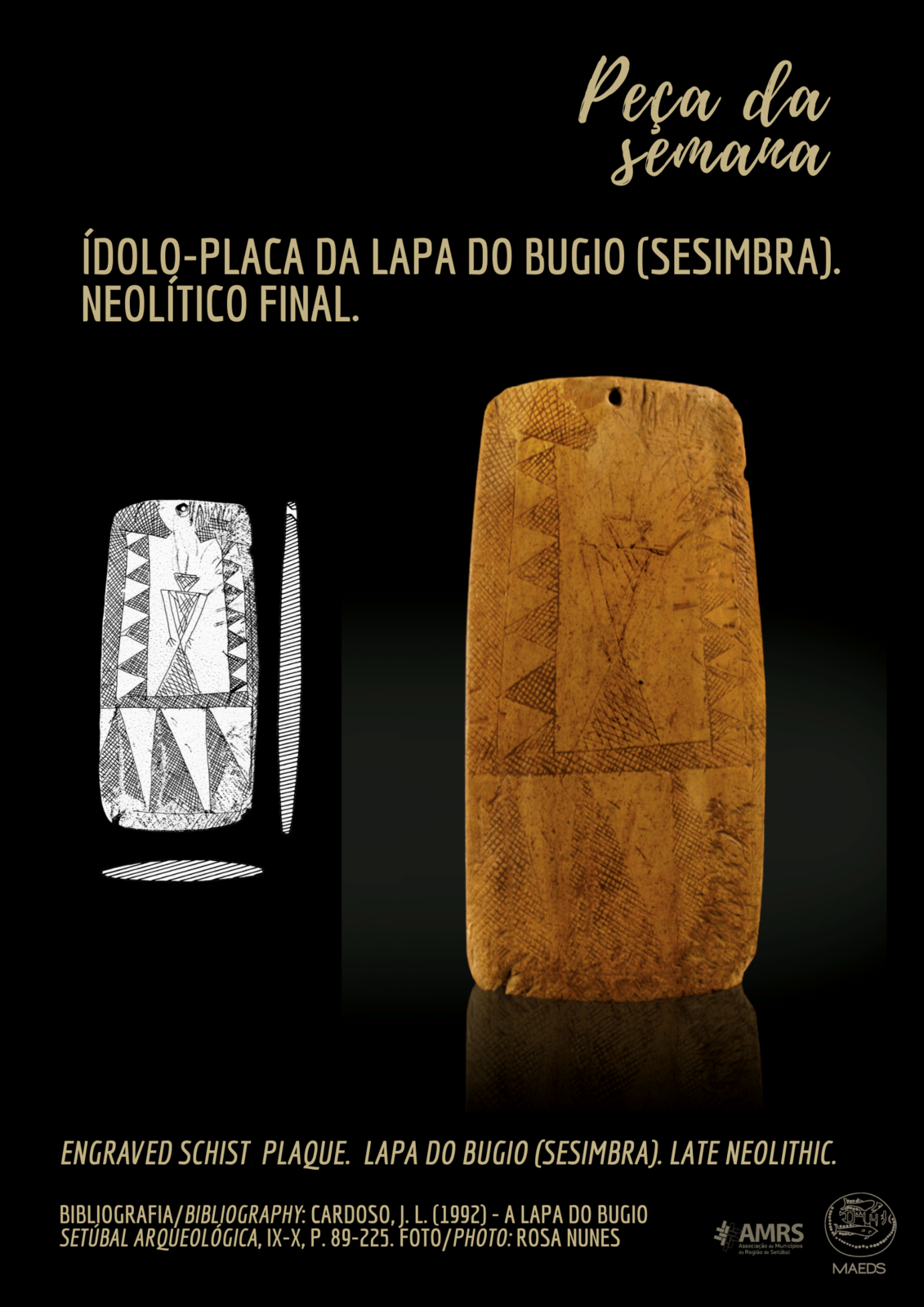 O exemplar apresentado, proveniente de ossuário da Lapa do Bugio, do Neolítico final, e pertencente ao acervo do MAEDS, apresenta uma iconografia única. No interior do corpo da divindade feminina, encontra-se figurado o ídolo almeriense, muito divulgado em contextos coevos do Sudeste da Península Ibérica, manufacturado frequentemente em placa óssea. Podemos assim ler neste ídolo-placa uma alusão à maternidade, mas mais ainda, à interacção entre as costas atlântica e mediterrânea do sul da Ibéria e apreender uma narrativa que com 5000 anos nos indica ainda caminhos com futuro.