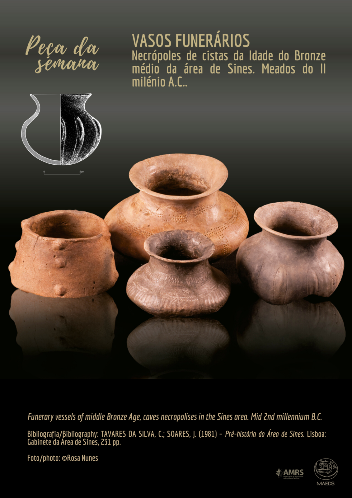 The ceramic containers represented were found in the archaeological excavations of several cist necropolis in the region of Sines. Ceramic forms with strangled neck imitate metallic models and accompanied the dead of high social status, deposited in lateral decubitus and flexed position in stone boxes, where the earth supposedly would not enter, protected by tumulus and aggregated in cemeteries. This pottery is dated to the mid and third quarter of the 2nd millennium BC (1500-1250 cal BC), and integrates the Southwest Bronze Age Culture, which encompassed the South of Portugal, Andalusia and Spanish Extremadura. The Southwest enters in a phase of economic and social recovery after the collapse of its strongest neighbor, the State of El Argar.